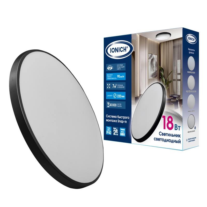 Светильник светодиодный акриловый 220мм IONICH "Snap In"18 Вт 5000 К 1620Лм IP40 черный S=7м2 2696*1/20