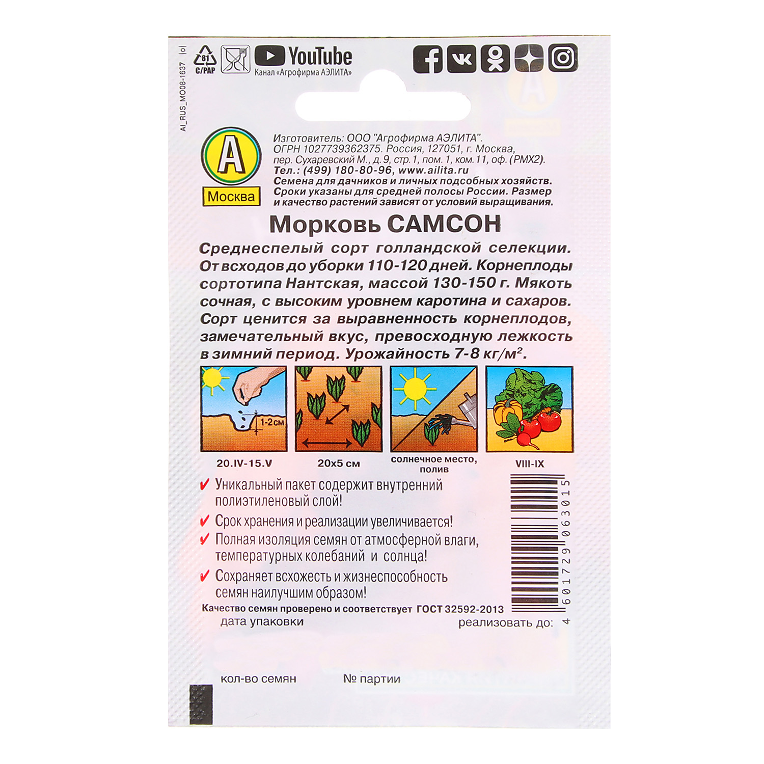 Семена Морковь Самсон 0,5гр Аэлита Лидер *10/500