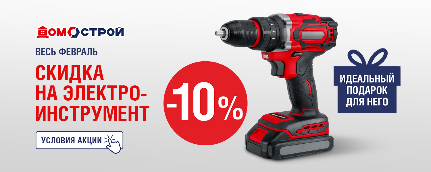 Пора выбирать подарки к 23 февраля — и делать это выгодно! Весь февраль — скидка -10% на электроинструмент. Самое время порадовать близких полезным и практичным подарком. Электроинструмент — отличный вариант для тех, кто любит мастерить, заниматься ремонтом или просто ценит хорошие вещи для дома и дачи.
